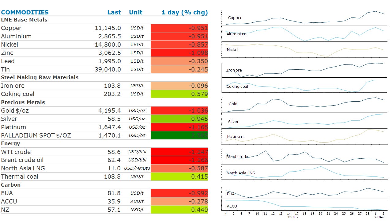Geopolitical risks continue to hang over energy markets. Oil declined despite Russian oil struggling to find buyers due to US sanctions. Metals were mixed amid signs of weakness in demand in China.