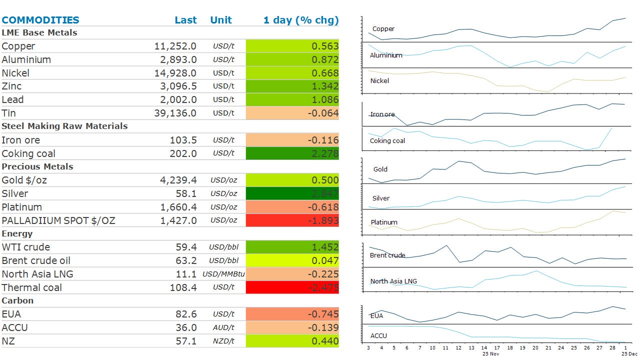 Copper rose to a record high, as concern over supply shortages grips the market. Copper is central to the global economy’s electrification and the energy transition and rose by 1% to USD11,295/t on the LME exchange. In the US, copper gained 1.6% as concerns over future tariffs triggered a wave of buying. Several commodity traders have approached Chilean producers to lock in US annual supply deals for 2026, with some paying more than USD500/t over benchmark prices on the LME. Kostas Bintas, head of metals at Mercuria Energy Group, warned that a rush to ship metal to the US risks draining the rest of the world’s inventories. He said more than 500kt could arrive in the US in the first quarter of 2026. There was an industry gathering in Shanghai last week, and supply shortages were high on the agenda. Chinese smelters are facing tough negotiations over annual processing fees, given spot charges are still in negative territory. Data back up these concerns, with Chile’s national statistics agency reporting that October production of copper fell 7% y/y to 458,405t.
