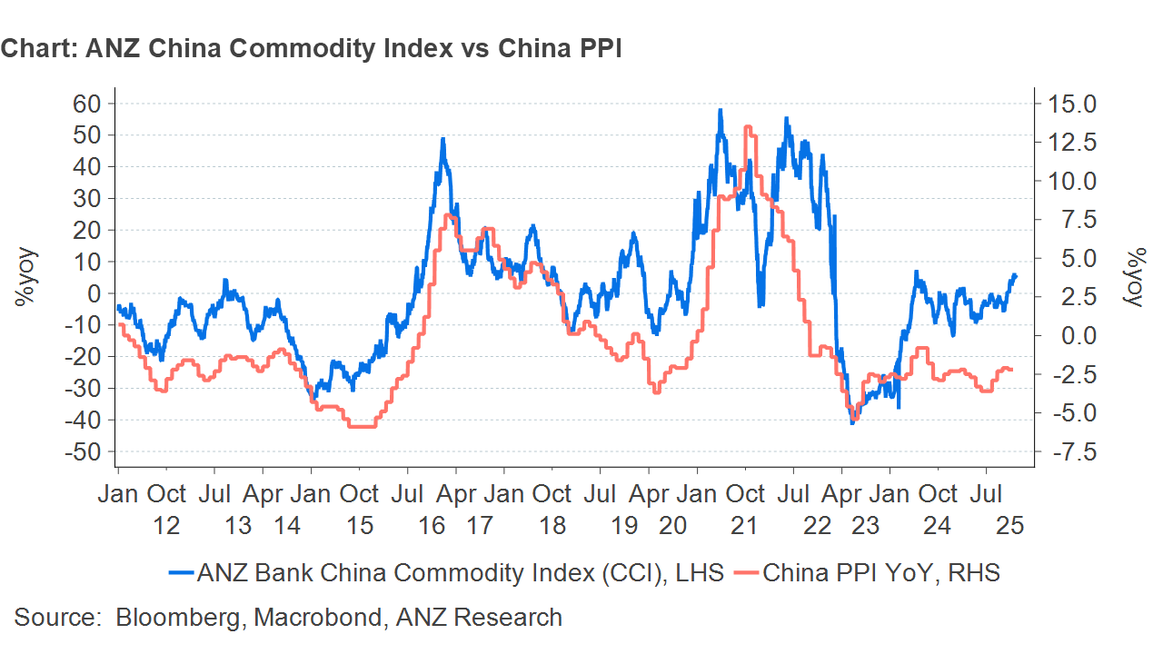 China has been stuck in an inflationary spiral amid increase competition in key industrial sectors. There was hope that rising commodity prices could help alleviate some of that pressure. ANZ China Commodity Index has a good correlation with China PPI. However, recent gains in the CCI (driven by gains in industrial metals) have failed drag PPI higher.