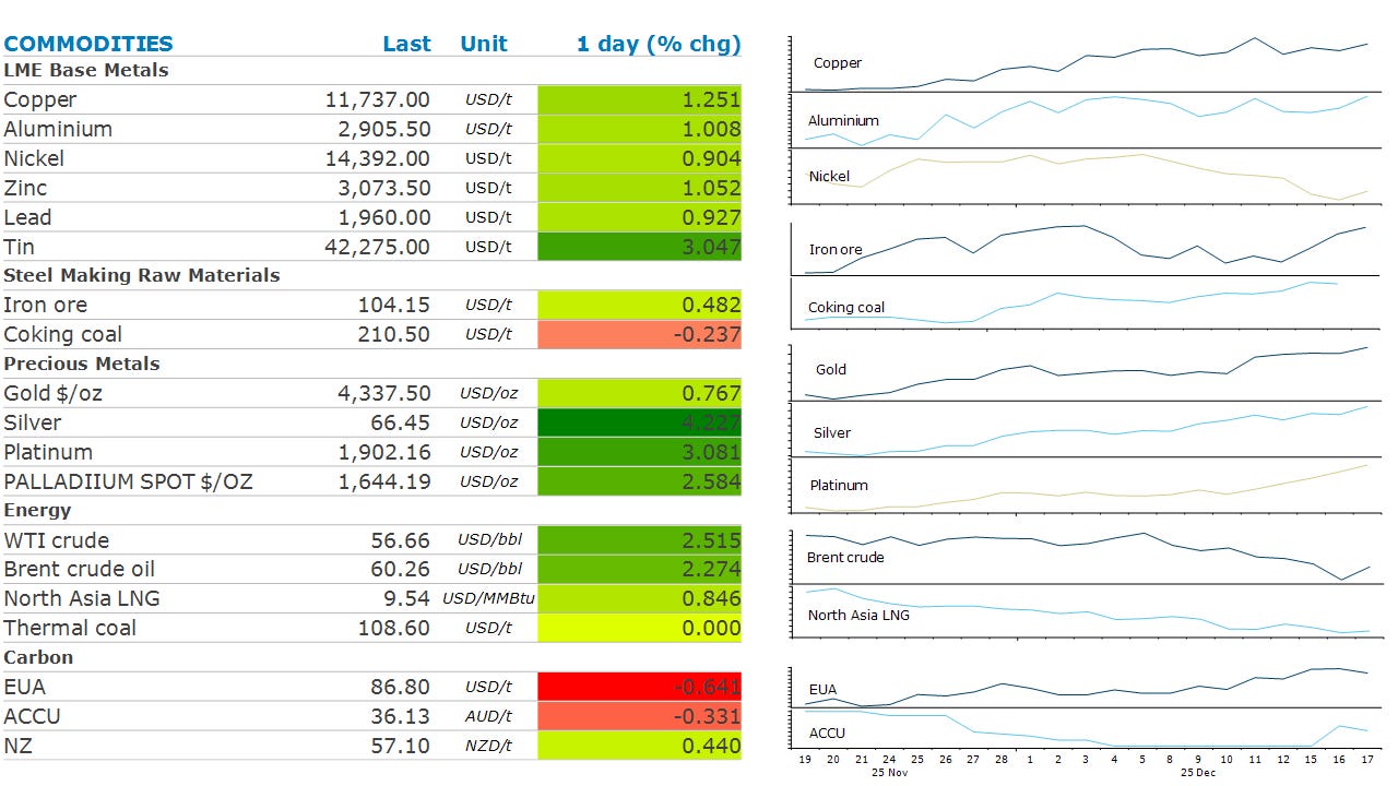 Gold rose, approaching record levels, as investors sought haven assets amid rising geopolitical tensions around Venezuela. Expectations of further rate cuts also boosted sentiment. Platinum hit a 17-year high amid tight supply and elevated trading activity in a new Chinese future contract. The London market continues to show signs of tightening as banks store metal in the US to insure against the risk of tariffs. The annualised cost of borrowing platinum for one month is at around 14%, a historically high level. This has been exacerbated by the new contract on the Guangzhou Futures Exchange. Trading volumes on the new offering were significant, raising the prospect of rising imports into the Chinese market.
