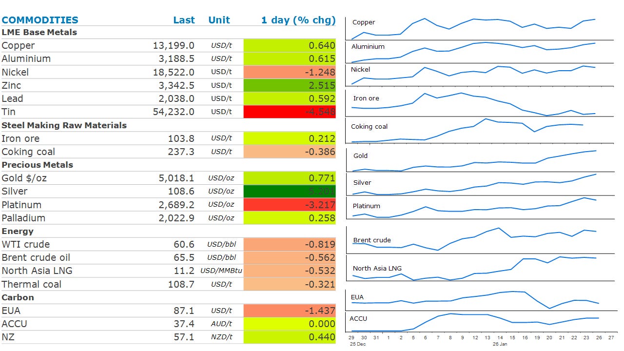 The unprecedented rally in the precious metals sector gained momentum. Gold broke through the USD5000/oz level while silver recorded its biggest one-day gain to a record USD117/oz. A massive sell-off in the Japanese bond market last week triggered the most recent rally. This was exacerbated this week after it was reported that the US may help Japan support the yen. Such coordinated intervention has not occurred since 2011, instilling greater concern in markets. Worries over US Federal Reserve independence have also generated strong demand for alternative safe haven assets. With geopolitical, political, economic and financial risks at their highest in decades, the investment case for gold has broadened across investor types (retail, institutional and central banks) and regions, with countries such as China and India actively promoting gold investment. Silver’s gains have been so strong that retail investors in Turkey are willing to pay as much as USD9/oz above global benchmark prices in London to get their hands on it.