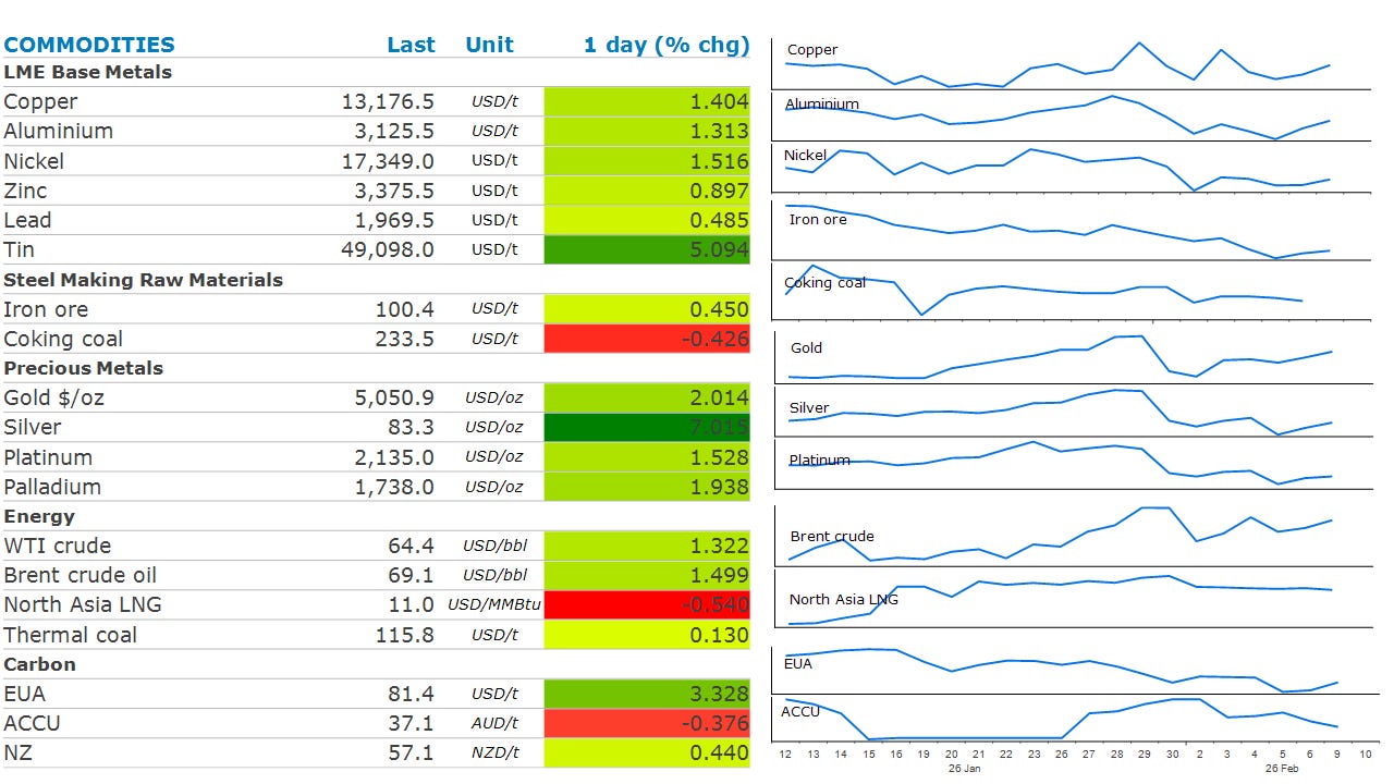 Events: International Energy Week, London (through 12 Feb); Oslo Energy Forum (through 12 Feb); E‑World, Essen (through 12 Feb); Consensus Hong Kong (through 12 Feb); Metals — earnings: Titan Co; First Quantum; LME commitment‑of‑traders positions.